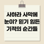 사하라에 눈이? 기후변화 미스터리와 숨겨진 의미 뜨겁게 타오르는 태양, 끝없이 펼쳐진 모래 언덕. 상상조차 하기 힘든 사하라 사막의 설경이 현실로 나타났습니다. 단순한 진기한 풍경을 넘어, 이례적인 사막의 눈은 지구온난화 시대, 우리가 마주한 기후변화의 심각성을 극명하게 보여주는 상징입니다. 과연 사하라에 눈이 내린다는 것은 우리에게 어떤 메시지를 전달하는 걸까요? 그리고 우리는 이 기후 미스터리에 어떻게 대처해야 할까요?