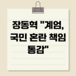 장동혁 “계엄, 국민 혼란 책임 통감” 최근 장동혁 국민의힘 대표가 과거 비상계엄에 대한 책임을 통감하며 정치권에 큰 파장을 일으키고 있습니다. 이 발언은 단순한 사과를 넘어, 복잡하게 얽힌 정치적 배경과 향후 정국에 미칠 영향에 대한 심도 깊은 분석을 요구합니다. 본 글에서는 장 대표의 발언 배경, 정치적 함의, 그리고 앞으로 우리가 주목해야 할 점들을 다각도로 분석하여 명확하고