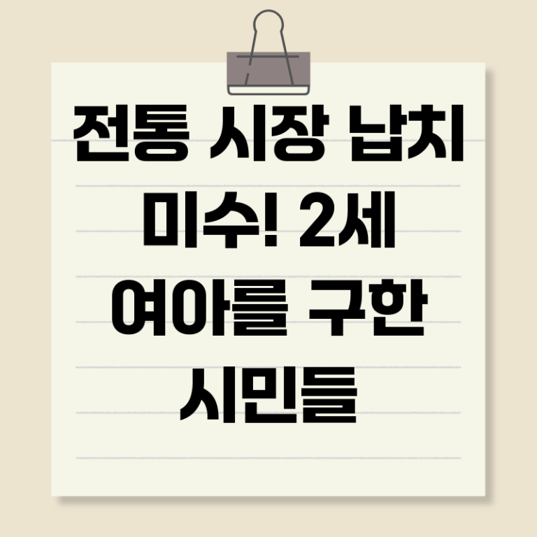 사건은 OO시 OO구에 위치한 전통시장에서 발생했습니다. 한 남성이 2세 여아를 데리고 가려던 것을 주변 상인과 시민들이 목격하고 제지하여 아이를 구할 수 있었습니다. 당시 상황은 매우 긴박했으며, 남성은 아이를 데리고 도주하려 했던 것으로 알려졌습니다. 다행히 시민들의 용감한 대처와 빠른 신고로 경찰이 출동하여 남성을 현장에서 체포할 수 있었습니다. 이 사건은 순식간에 온라인 커뮤니티와 SNS를 통해 확산되었고, 아이를 구한 시민들에게는 칭찬과 격려가 쏟아졌습니다.